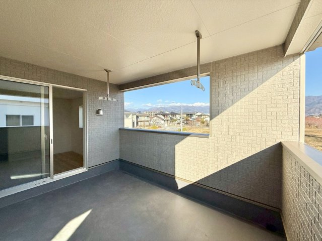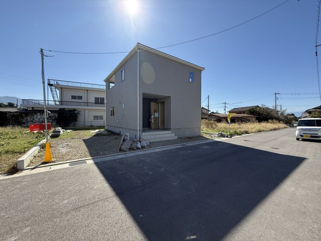 山梨市の新築住宅。カウンター付きシステムキッチンやトイレ2か所、浴室乾燥機など設備充実。ルーフバルコニーや床下収納付きで暮らしにゆとり。駐車4台可、防犯面も安心です。