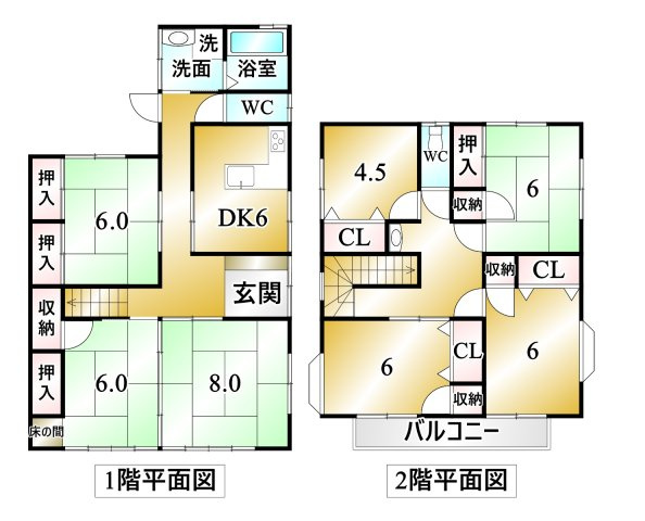 DK 6.0帖 1室 / 和室 8.0帖 1室 / 洋室 6.0帖 2室 / 洋室 8.0帖 2室 / 和室 6.0帖 1室 / 洋室 4.5帖 1室 / |