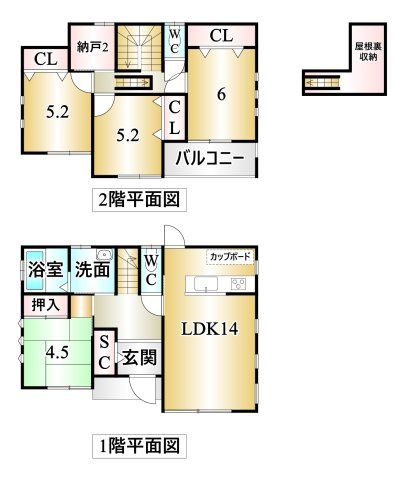 LDK 14.0帖 1室 / 和室 4.5帖 1室 / 洋室 6.0帖 1室 / 洋室 5.2帖 2室 / |