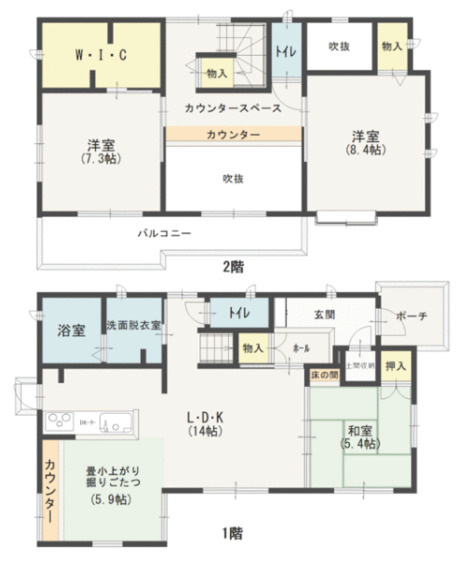 ・2階8.4帖洋室、7.3帖洋室で各部屋が広く確保されています