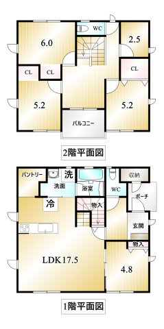 LDK 17.5帖 1室 / 洋室 4.8帖 1室 / 洋室 6.0帖 1室 / 洋室 5.2帖 2室 / S(納戸) 2.5帖 1室 / |