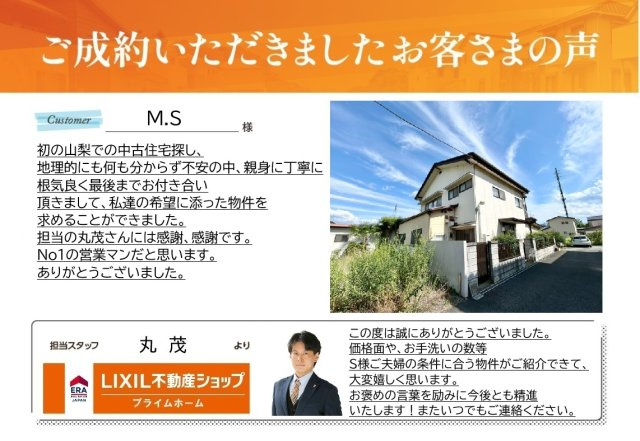 初の山梨での中古住宅探し、地理的にも何も分からず不安の中、親身に丁寧に根気良く最後までお付き合い頂きまして、私達の希望に添った物件を求める事が出来ました。 担当の丸茂さんには感謝、感謝です。 No1の営業マンだと思います。ありがとうございました。
